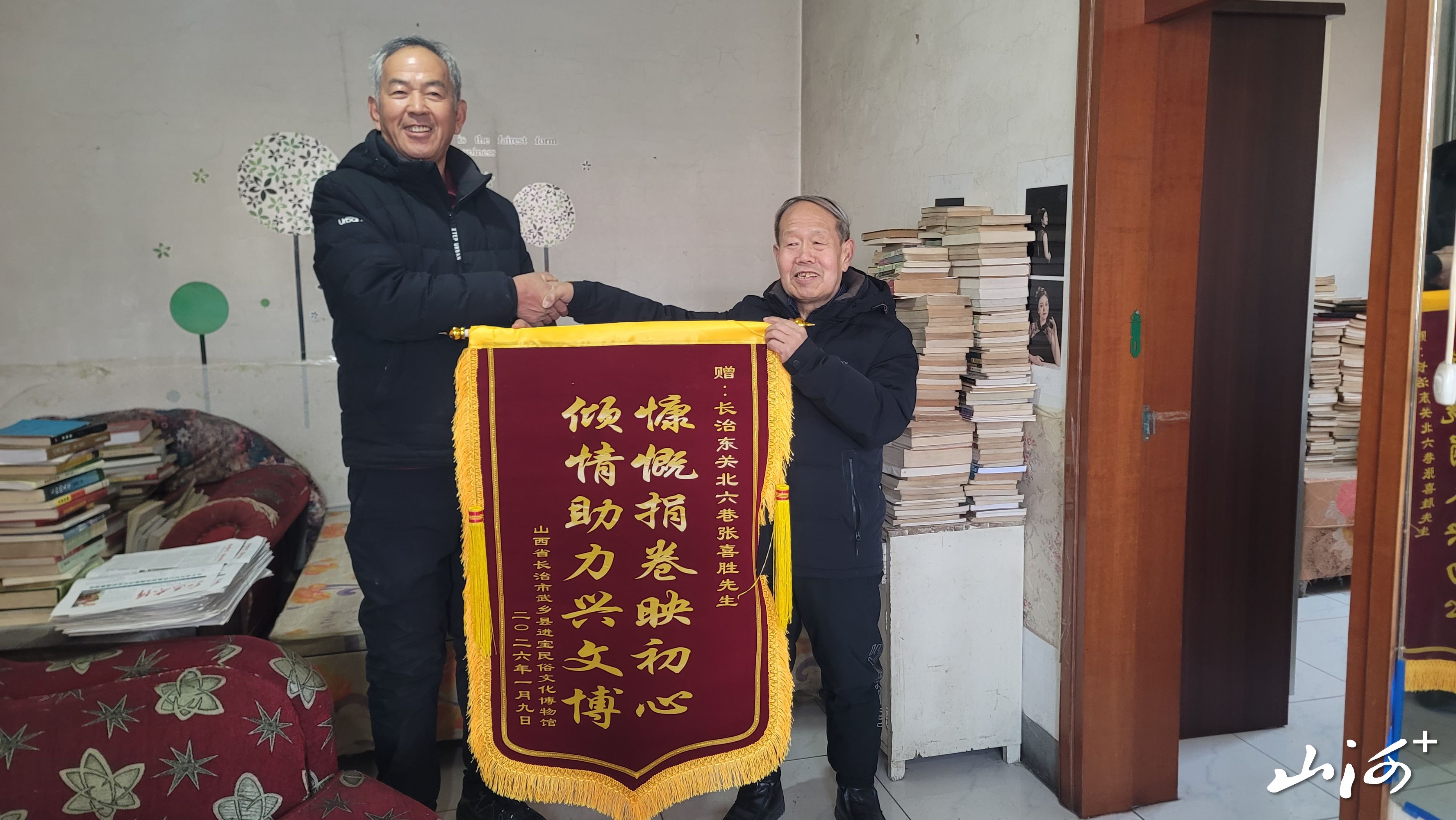 1月10日的捐书仪式上,来自武乡县进宝民俗文化博物馆的段进宝先生在《捐赠证书》中写道:“长治东关北六巷张喜胜先生:承蒙您向武乡县进宝民俗文化博物馆惠赠图书3000余册,深荷厚意。我们将遵照捐赠意愿,服务于公益文化事业。特颁此证,铭记善举!”与此同时,武乡县进宝民俗文化博物馆还将一面书有“慷慨捐卷映初心倾情助力兴文博”14个大字的锦旗相赠,那情那景传递着一个共同的心声。