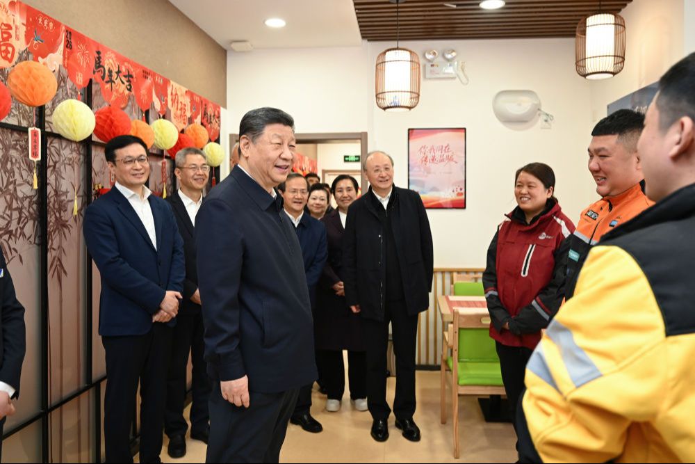 这是2026年2月10日上午,习近平总书记在北京市西城区新街口街道父母食堂考察时,同在这里休息的快递小哥亲切交流。新华社记者 谢环驰 摄