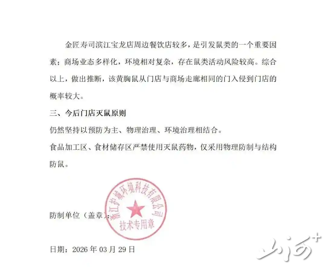 此外,该品牌还就事件原因作出说明:3月29日16时26分,一只黄胸鼠从外部突然闯入门店,经初步核查,“系从门店与商场走廊相通的门侵入,并非店内滋生”。公告附有第三方虫害防治公司出具的分析报告,称“周边餐饮密集、商场环境复杂”是诱因。