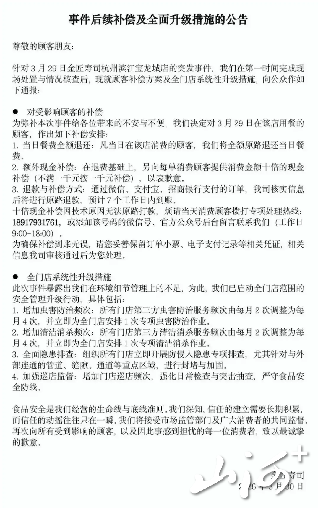 山西晚报·山河+记者注意到,3月30日中午,金匠寿司通过官方渠道发布《事件后续补偿及全面升级措施公告》,宣布三项补偿举措:全额退还3月29日当日餐费,原路返还至支付账户,7个工作日内到账;额外提供十倍现金补偿(不足1000元按1000元计);因技术限制,十倍补偿需通过专项热线登记领取。