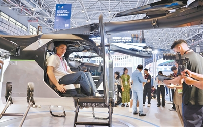 观众在第六届消博会科技消费展区体验分体式飞行汽车。人民日报记者 蒋雨师摄