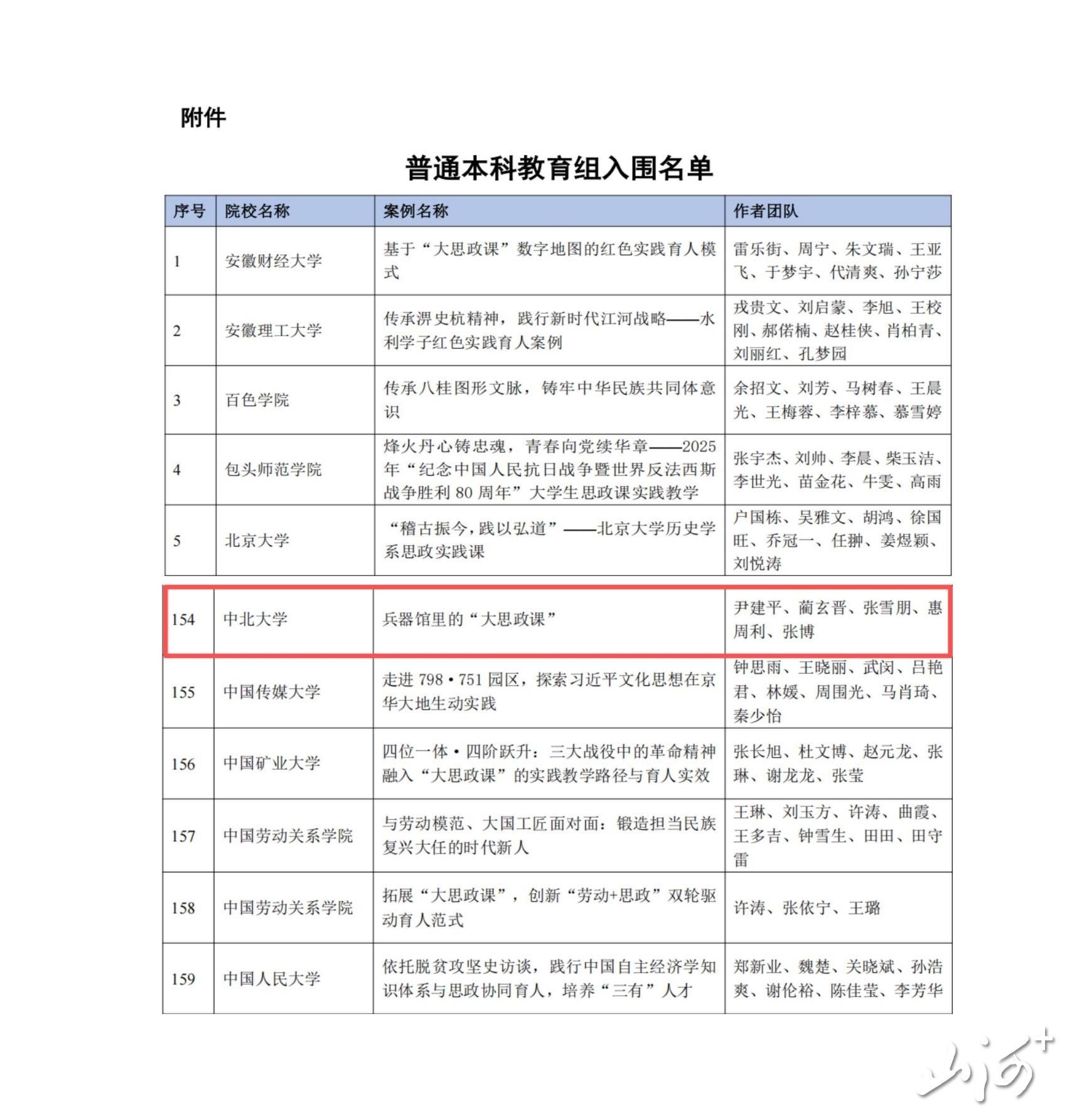 山西晚报·山河+讯 近日,由高等教育出版社与新华网联合开展的全国高校“大思政课”实践教学典型案例征集活动评审结果正式揭晓。经专家严格评审遴选,全国共292个典型案例成功入围,其中普通本科教育类案例171个,山西省共有10个本科高校案例入选。中北大学报送的《兵器馆里的“大思政”课》案例榜上有名。