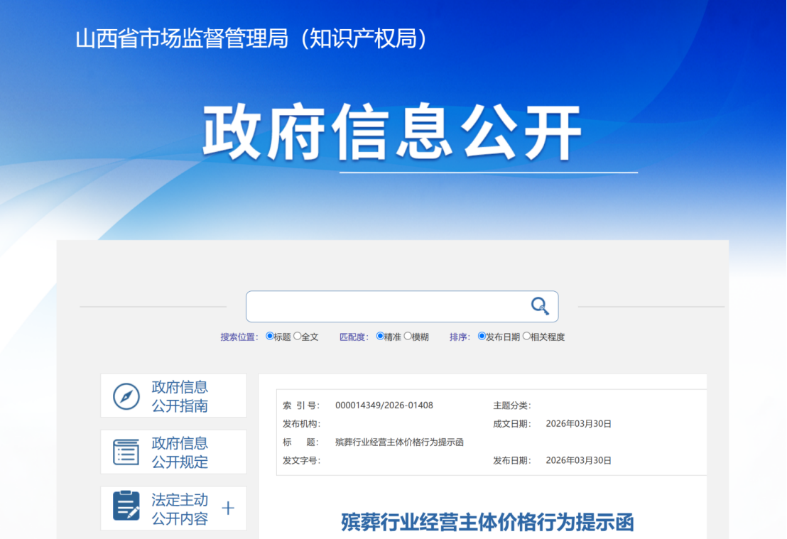 近日,记者从山西省市场监督管理局获悉,清明节临近,殡葬服务与丧葬用品需求显著增加,为保障群众合法权益、维护殡葬行业价格秩序,山西省市场监督管理局于2026年3月30日向全省各殡葬服务机构及相关经营主体发布价格行为提示函,督促各方依法合规经营,营造文明有序的祭扫环境。