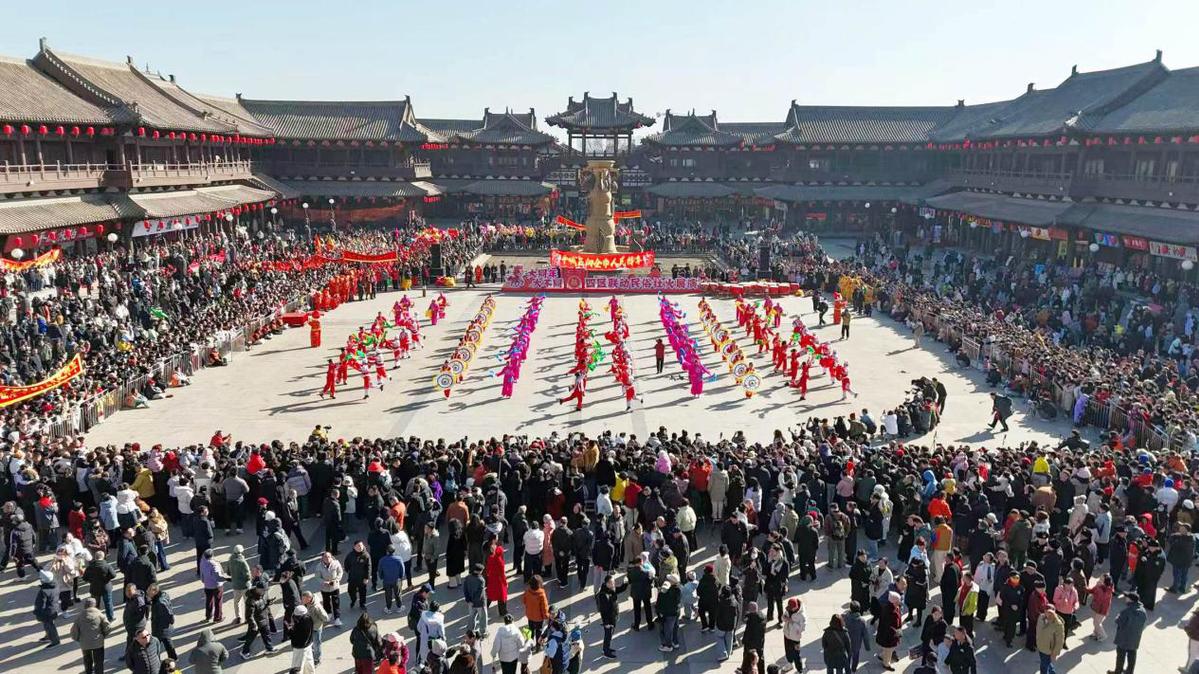 马年春节期间,游客在山西大同古城观赏传统社火表演。 俞占东 摄