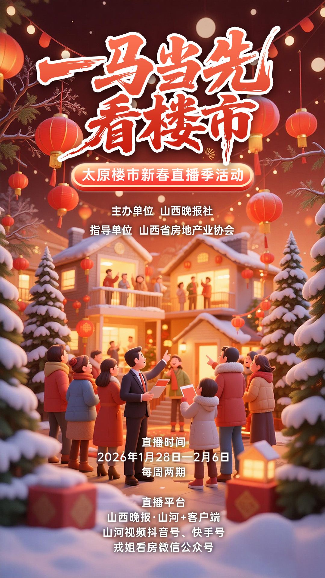 2025年,太原楼市在调整中积蓄力量,在分化中孕育新机。展望2026年,市场在政策引导与需求升级的双轮驱动下,正迈入高质量发展新阶段。本系列直播活动,旨在依托山西晚报的媒体公信力与平台优势,从政策到市场,从品牌到产品,多层次、多角度地解读楼市,为广大市民新一年购房、安居决策提供参考。从1月28日起,锁定“山河+”App、山河视频(抖音、快手)、戎姐看房微信公众号,资深业内大咖与您一起,拿捏2026太原购房好时机。