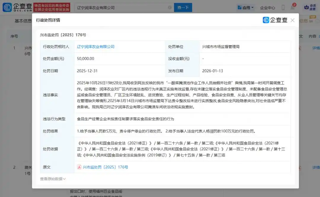 山西晚报·山河+讯 2月2日,山西晚报·山河+记者从企查查获悉,近日,“员工在酸菜池中抽烟吐痰”事件涉事企业——辽宁润泽农业有限公司的行政处罚结果已公开。该公司被处以5万元罚款,并被责令停产停业;其法定代表人杨某被处以100万元罚款。