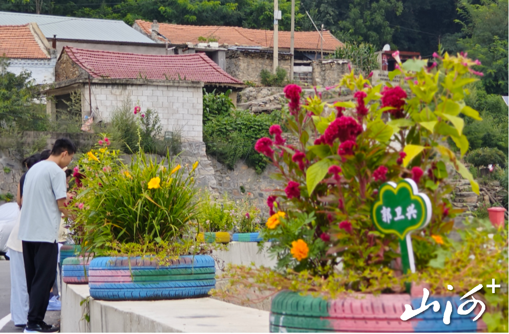 “这是小秦书记带着我们搞的‘认领式绿化’。轮胎里填满了土,春夏秋季栽着各色花卉,红的月季、黄的菊花、紫的牵牛,花开时节,非常漂亮。”村民郭卫兴正蹲在自家认领的“花盆”前翻土。
