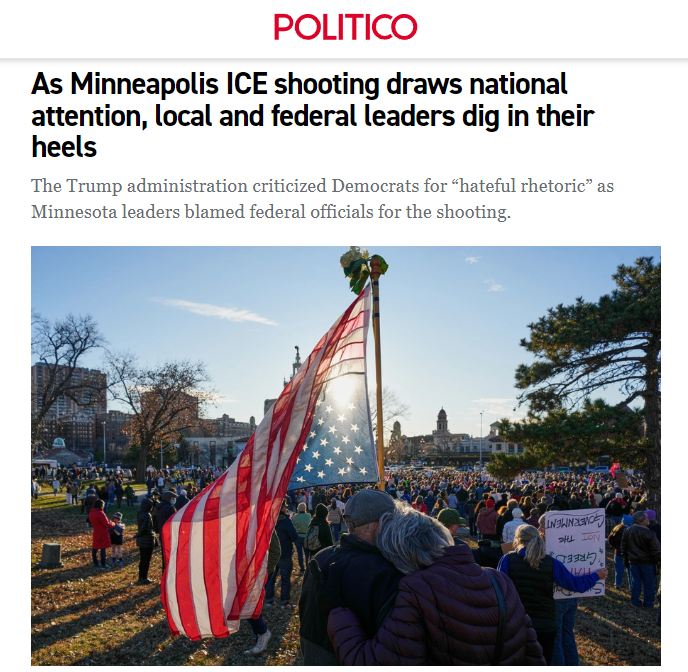 美国《政治报》网站11日的报道称,明尼阿波利斯女子被枪杀的事件成为全美移民执法斗争中的引爆点。地方和联邦政府之间分歧明显,相互指责对方加剧了全国的紧张局势。明尼阿波利斯的官员坚称,联邦政府官员在妖魔化移民和抗议者,导致暴力不可避免地升级。