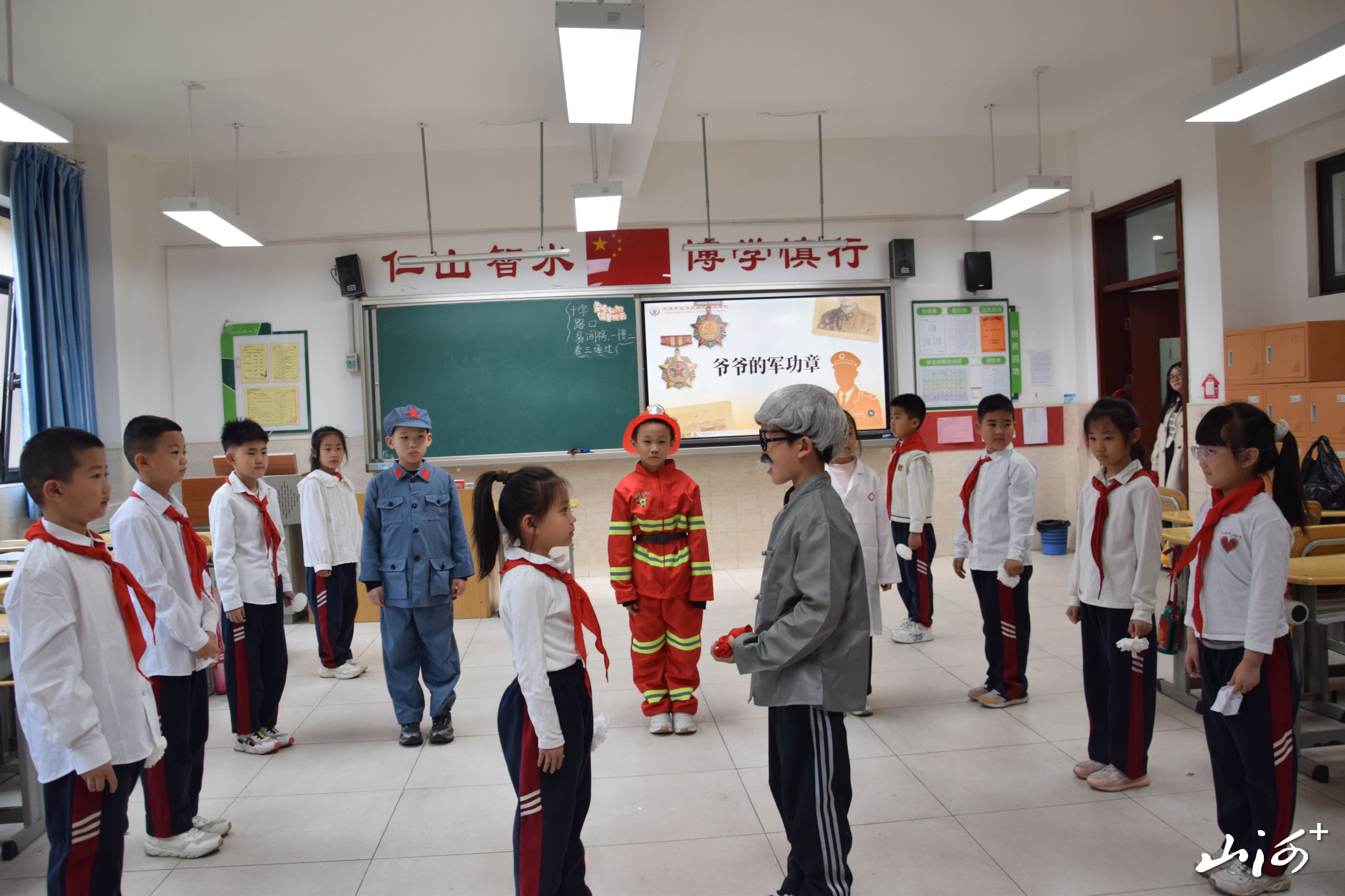 沉浸式情景剧《爷爷的军功章》成为课堂亮点,节目以祖孙对话、时空交融的新颖形式,串联起革命战争年代的先烈、逆行出征的消防员、守护生命的医护人员等不同时代的英雄群像。同学们在真情演绎中,真切读懂英雄们的坚守与奉献,深刻感悟当下平安幸福生活的来之不易。