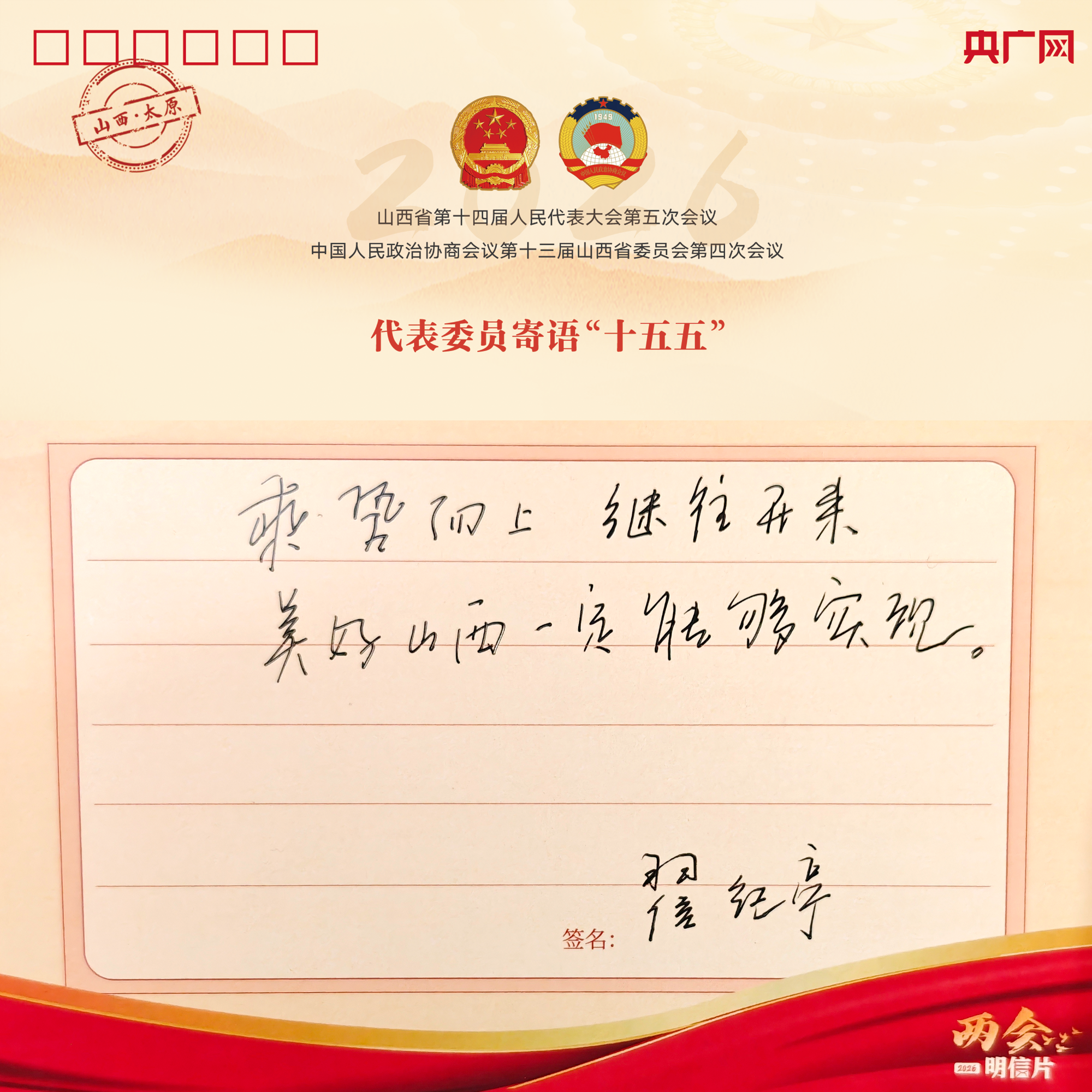 香甜的宁脆苹果、丰富的煤层气资源、优美的沿黄景色,千年前“大吉大宁”的美好祈愿已在眼前,翟纪亭代表在明信片上提笔写下对“十五五”的期盼——乘势而上,继往开来,美好山西一定能够实现。
