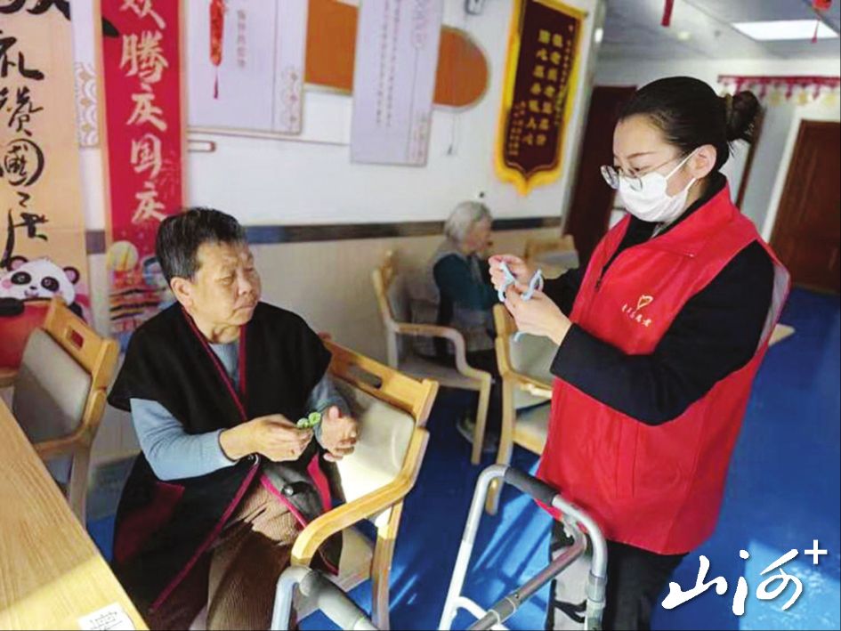 社区工作人员邀请老年居民开展绒花制作活动。