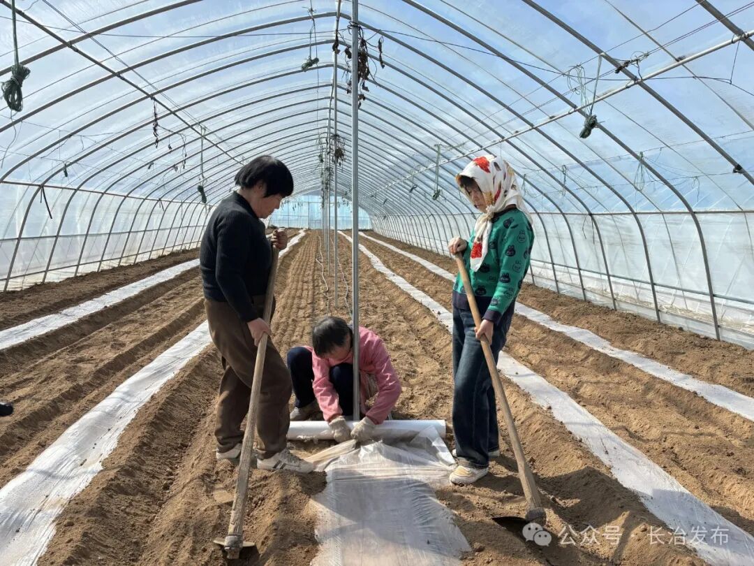 在位于苗庄镇苗庄村的长治市麦丰农业电子商务股份有限公司育苗基地里,连片大棚在阳光下格外醒目,现代化农业生产的繁忙景象尽收眼底。工人们三五成群、分工协作,正在开展地膜铺设与覆盖作业,有的拉膜展膜、有的覆土压边、有的固定地膜,动作麻利、配合默契,透明地膜顺着田垄整齐铺开,像给大地披上了一层“保暖衣”,既能保墒提温,又能防霜抑草,为种子发芽生长撑起了“保护伞”。