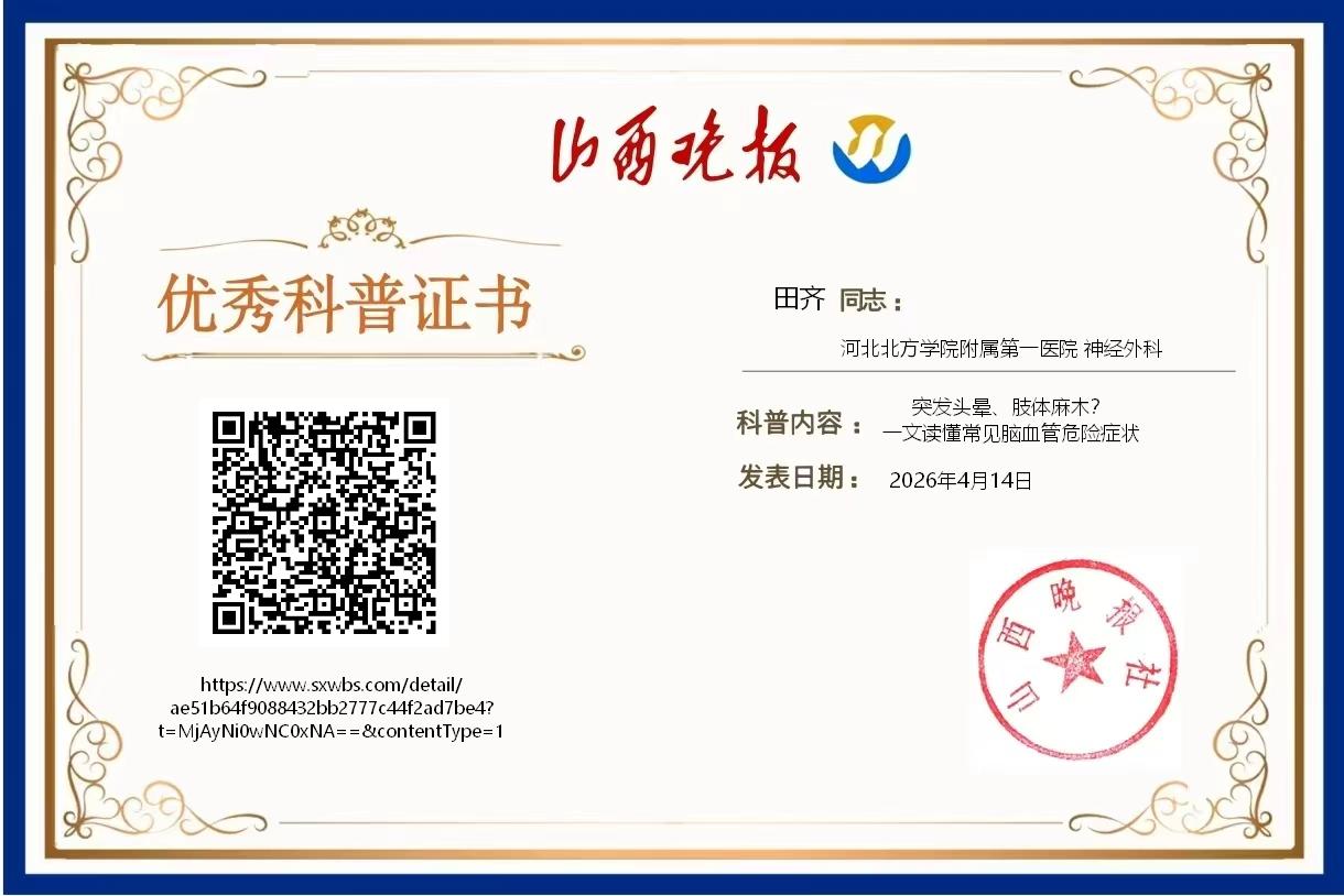脑血管疾病的危险症状,从来都不是“小毛病”,而是生命发出的“预警”。很多人因忽视、误解,错过了最佳救治时机,留下肢体残疾、言语障碍等后遗症,甚至失去生命。作为医务工作者,希望大家能牢记以上5个方面,学会识别脑血管危险症状,摒弃错误认知,做好日常预防。尤其是高危人群,要时刻关注自身身体变化,出现不适及时就医,不拖延、不侥幸。愿每一个人都能重视脑血管健康,读懂预警信号,守护好自己和家人的生命安全。