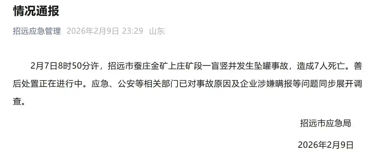 山西晚报·山河+讯 2月9日晚,山东省招远市应急管理局发布情况通报称,2月7日8时50分许,招远市蚕庄金矿上庄矿段一盲竖井发生坠罐事故,造成7人死亡。目前,善后处置工作正在有序进行。应急、公安等相关部门已同步对事故原因及企业涉嫌瞒报等问题展开调查。2月10日,山西晚报·山河+记者多次致电招远市应急管理局及涉事企业,试图了解事故详情及调查进展,电话均未接通。