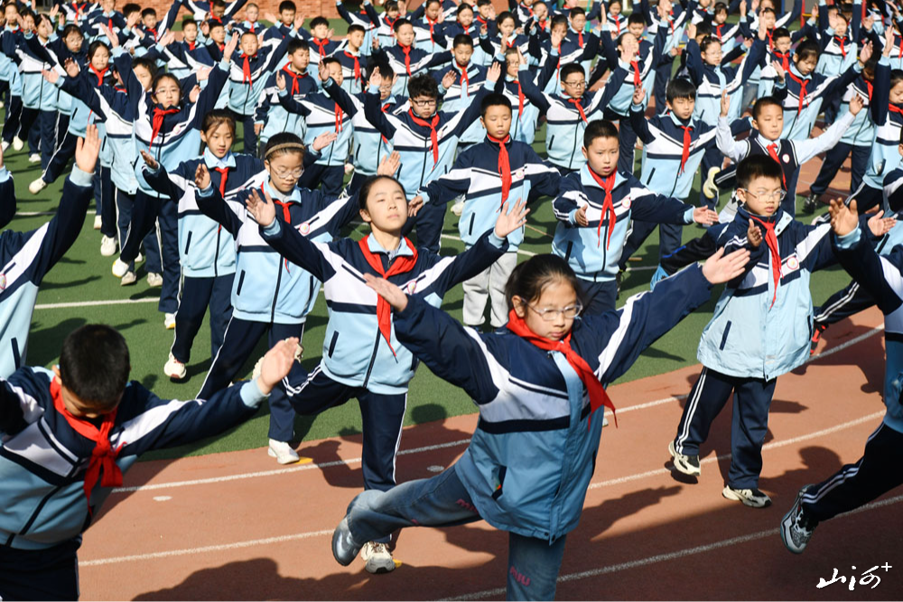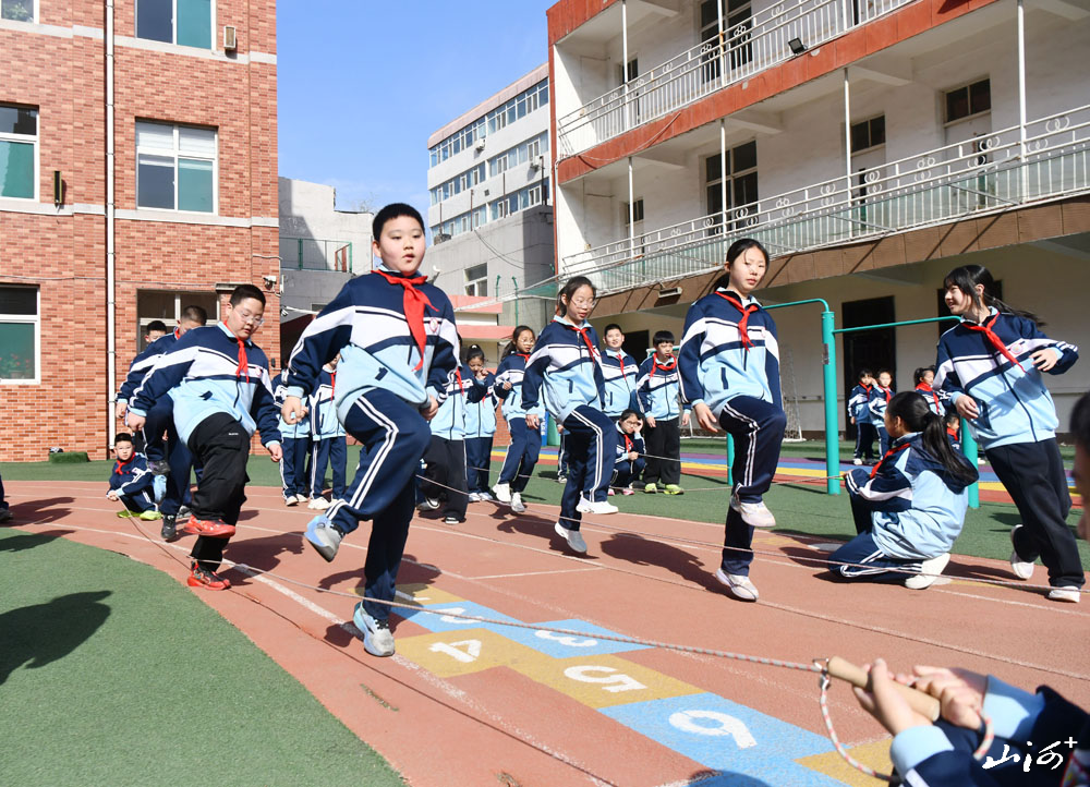 随后,整齐划一的第九套广播体操、活力满满的《中华美少年》体能操轮番上演。全校联动的特色 “跳大绳” 环节更是将现场氛围推向高潮,“平铺绳线体能训练”“腾空横杆”“穿越绳阵” 三种特色绳法,兼具趣味性、挑战性与团队性,不仅有效锻炼了学生的身体素质,更在互动协作中激发了学生的挑战欲、成就感和团队归属感,生动诠释了学校 “让运动成为孩子童年生活一部分” 的体育教育理念。