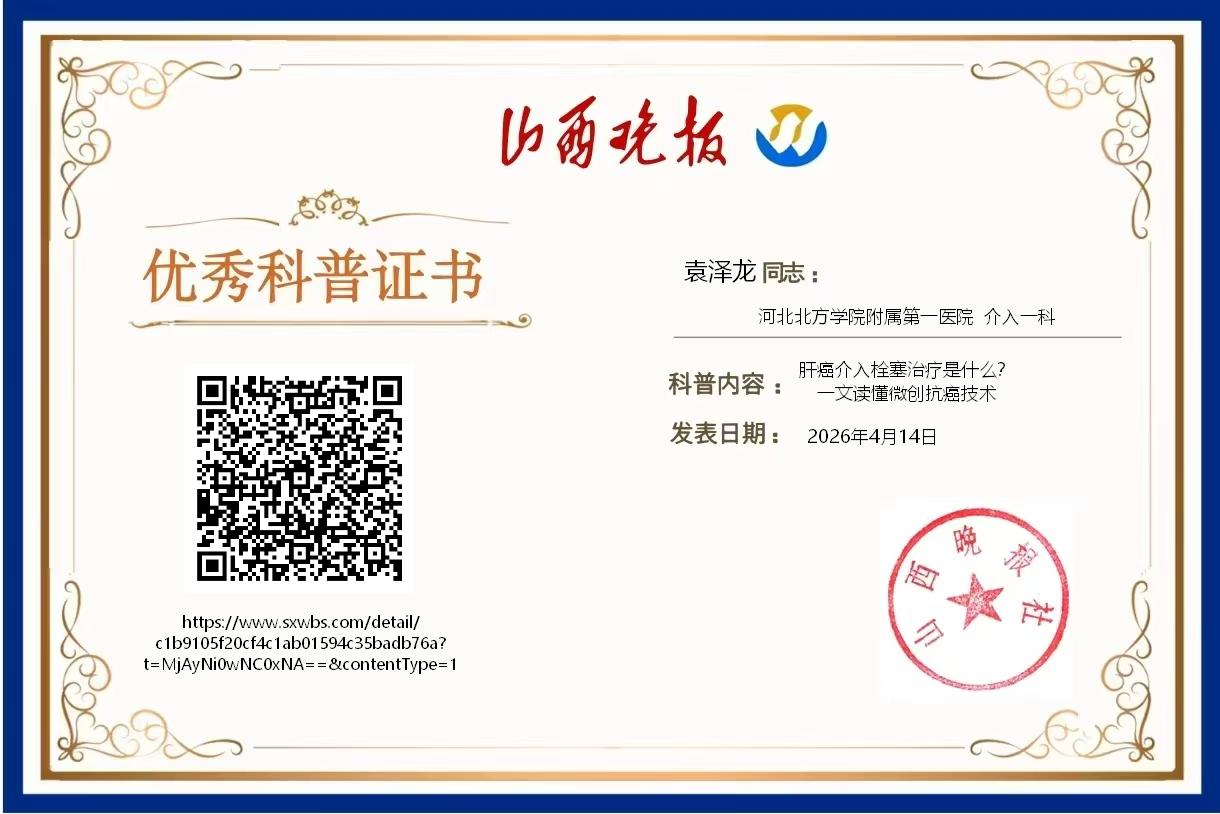 肝癌介入栓塞治疗,是中晚期肝癌患者的“微创希望”,它打破传统开腹手术局限,以创伤小、恢复快、疗效确切的优势,为很多肝癌患者带来生存机会。作为医务工作者,我们希望大家正确认识这项技术,消除恐惧和误区,不要因不了解而拒绝治疗。肝癌并不可怕,随着医学发展,微创治疗已成为肝癌治疗的重要方向,只要早发现、早诊断、早治疗,积极配合医生,就能有效控制病情,延长生存期、提高生活质量。愿每一位肝癌患者都能树立信心,勇敢面对疾病,在科学治疗下战胜病魔、重获健康。