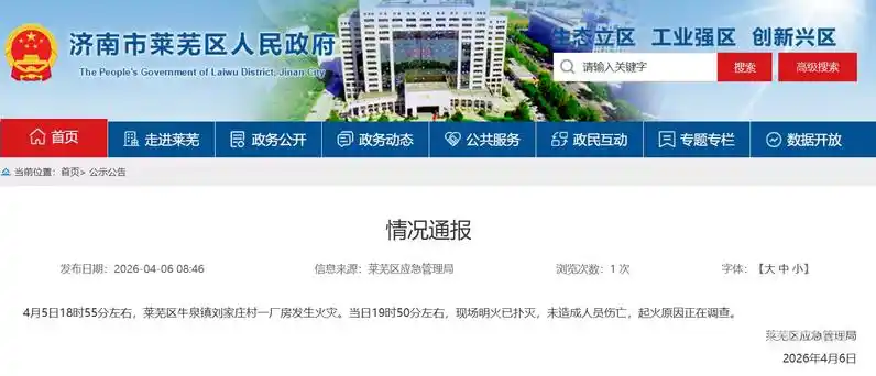 莱芜区应急管理局4月6日上午通报称,4月5日18时55分左右,莱芜区牛泉镇刘家庄村一厂房发生火灾,19时50分明火被扑灭,未造成人员伤亡,目前起火原因正在进一步调查中。