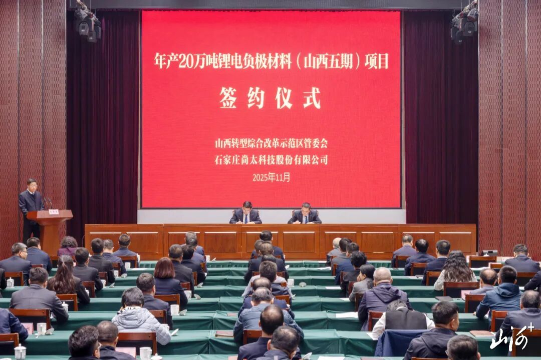 作为国内负极材料行业领军企业,石家庄尚太科技专注于锂电负极材料研发制造,2022年在深交所主板上市,2024年获评国家级专精特新“小巨人”企业。此次签约的五期项目将落户山西转型综改示范区阳曲工业园区,占地955亩,总投资40亿元,设计产能20万吨,将建设智能化、绿色化高端生产线并配套先进研发与运营体系,全面达产后预计年产值可达60亿元。