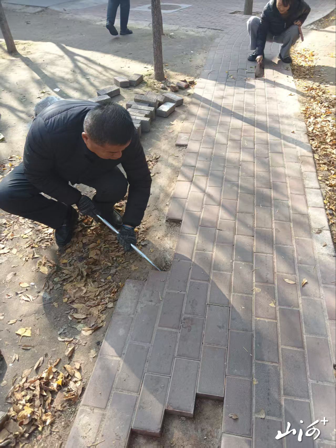 经过两个小时的奋战,这条连接九丰路与滨河西路辅路的小道彻底“焕新颜”——原本砖石缺失、坑洼破损的路面变得平整光洁,裂缝被彻底填补,积水问题也得到了根本解决,整条小道畅通无阻。