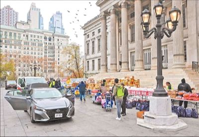 图为在美国纽约拍摄的一处免费食物发放点。