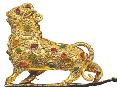 东汉中山穆王刘畅墓出土掐丝镶嵌金辟邪。河北定州博物馆藏
