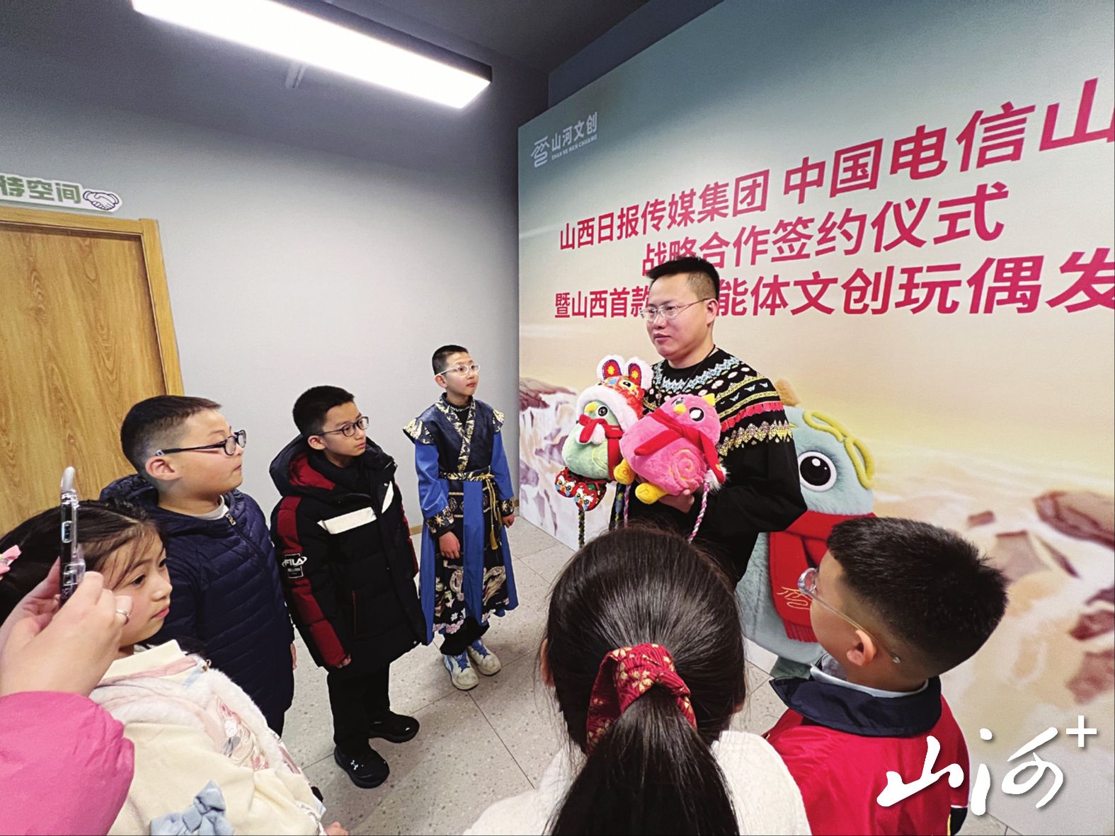 青年设计师倪云龙为山西晚报小记者们介绍AI智能体文创玩偶“鸮友”的设计理念。