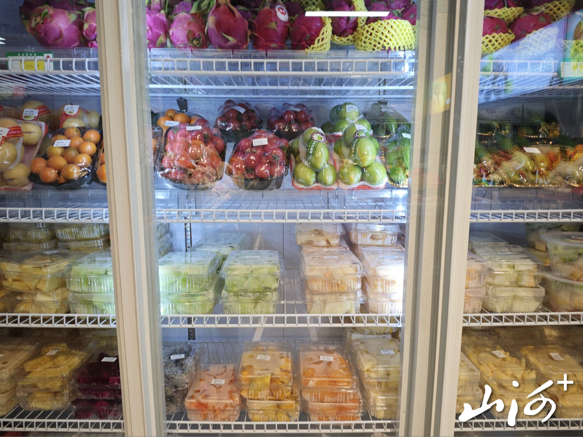 一家水果店的冷柜中存放着水果和盒装果切。