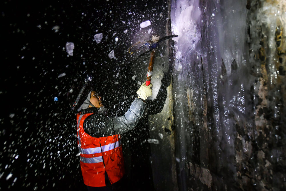 在一处隧道边墙,厚厚的冰层紧紧附着,记者尝试用冰镐砸开,刚一发力,冰花便四处飞溅,无数冰渣像长了眼睛一样,精准钻进眼睛、嘴巴、衣领口等部位,让人不时浑身打激灵。记者只好尽量用鼻子深呼吸,眯着眼睛,硬着头皮使劲乱砸一通,抬头一看,坚硬的冰块只被砸下了浅浅的外壳。梁贵宝提醒道:“打冰要用腰上的巧劲儿,击打冰层侧面紧贴隧道的部分。”他说着挥起冰镐示范了两下,整个冰层应声而落。