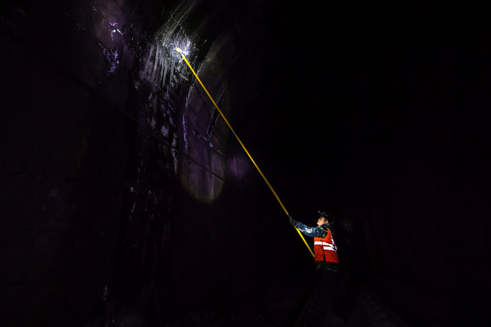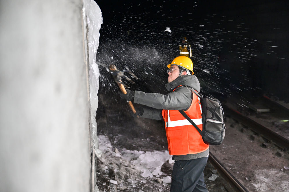 可梁贵宝和工友们走在轨枕上,却如履平地。今年34岁的工友胡飞笑着说:“刚开始也不习惯,但现在我们已形成了肌肉记忆。”他们的目光,始终盯着隧道顶,头顶的探照灯像雷达一样,在黑暗中搜寻冰锥的踪迹。
