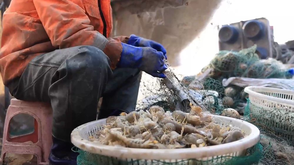 在无棣县埕口镇,渔民清晨便驾船出海。随着渔网收起,一只只活蹦乱跳的琵琶虾跃上甲板。渔民随即进行分拣、清洗和装筐。