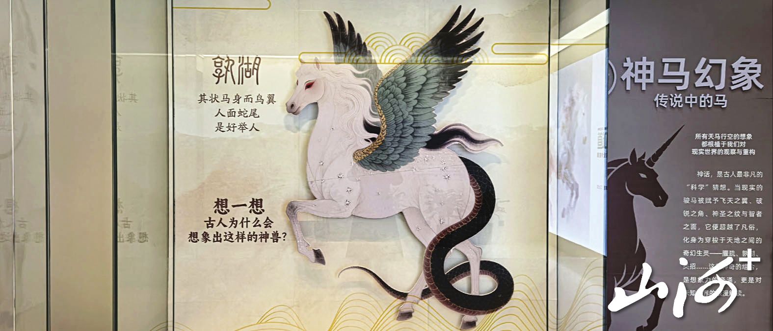 带着疑问,山西晚报·山河+记者步入“神马都知道”——马的奥秘科学文化展厅,就被眼前“神马幻想——传说中的马”所吸引。在这里,所有天马行空的想象,都根植于我们对现实世界的观察与重构。现实的骏马被赋予飞天之翼、破锐之角、神圣之纹与智者之面,它超越了凡俗,化身为穿梭于天地之间的奇幻生灵——孰湖、英招……这些神奇的组合,是想象力的奔涌,更是对未知世界的浪漫解读。邂逅在神话苍穹里腾云驾雾的神驹,会看到人类对力量、速度与自由的原始渴望。