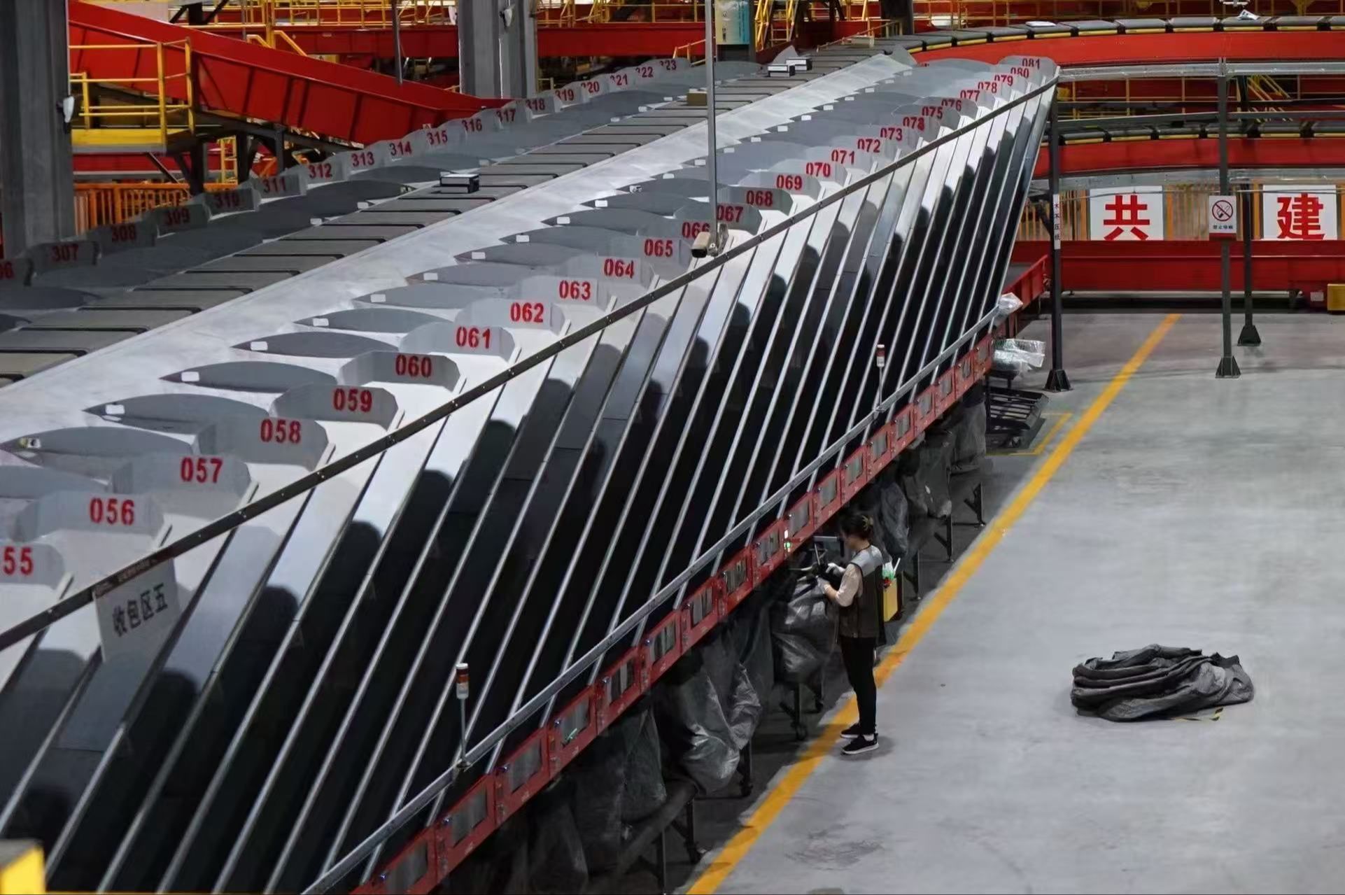 在各功能区域,各类智慧设备各司其职、各展其长,构建起全流程智能化作业体系:卸车区配备28个驼峰伸缩式皮带机,较原有设备实现大幅扩容,可灵活调节伸缩长度与高度,有效缩短卸车搬运距离,配合止停踏板设计,进一步降低不规则件剥离难度与堵件风险,卸车最大产能可达50400件/小时;NC区(不规则件分拣区)采用1条自动化窄带分拣机搭配1条人工分拣线,依托六面扫+AI智能识别技术,无需人工手动摆件,可高效分拣纸箱、软包、异形件及大型包裹,主线运行速度达1.5m/s,单条窄带分拣线产能达3600件/小时,人工分拣线可实现2000件/小时产能,覆盖44个分拣流向,兼顾效率与精准度;矩阵区搭载10条H型高速摆轮、10个智慧安检机及10个RFID识别通道机,依托顺丰自研SSS超级智能分拣系统,采用立体矩阵式布局,实现安检、识别、分拣、输送全流程智能化管控,最大分拣能力达55000件/小时;木马分拣机凭借立体循环式设计,兼具节约空间、扁平件兼容性强、维修便捷、安全高效等优势,单套分拣效率可达6000件/小时,配备336个格口,小件分拣柔性高、落件安全率极高,可精准分拣规格≤3kg、长≤400mm、宽≤300mm的信封件、薄件、软包件等各类小件快件。