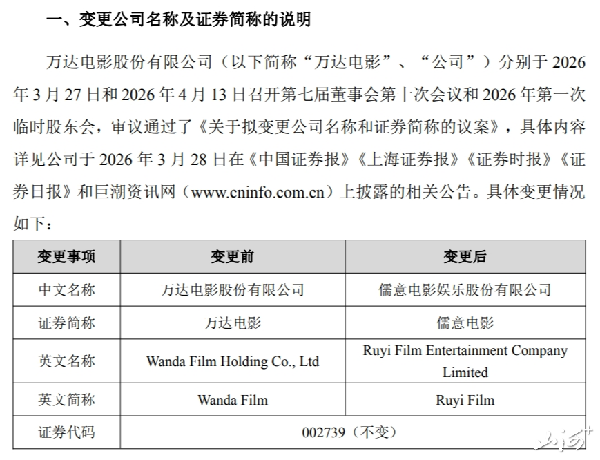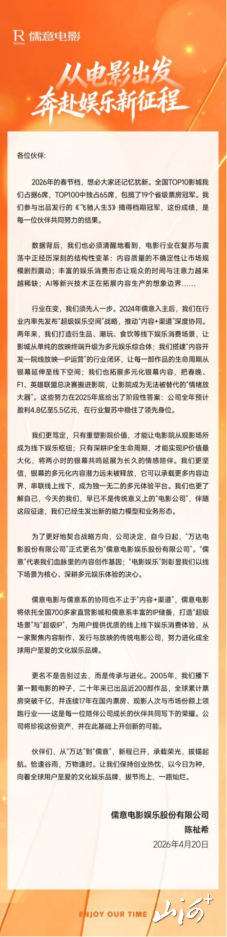 山西晚报·山河+讯 4月19日,万达电影发布公告,宣布正式更名为儒意电影娱乐股份有限公司。4月20日起,公司证券简称变更为“儒意电影”,证券代码“002739”保持不变。20日上午,儒意电影董事长兼总裁陈祉希发布全员信称,公司更名成儒意电影,是为了更好地契合战略发展方向,“儒意”代表血脉里的内容创作基因;“电影娱乐”彰显以线下场景为核心、深耕多元娱乐体验的决心。