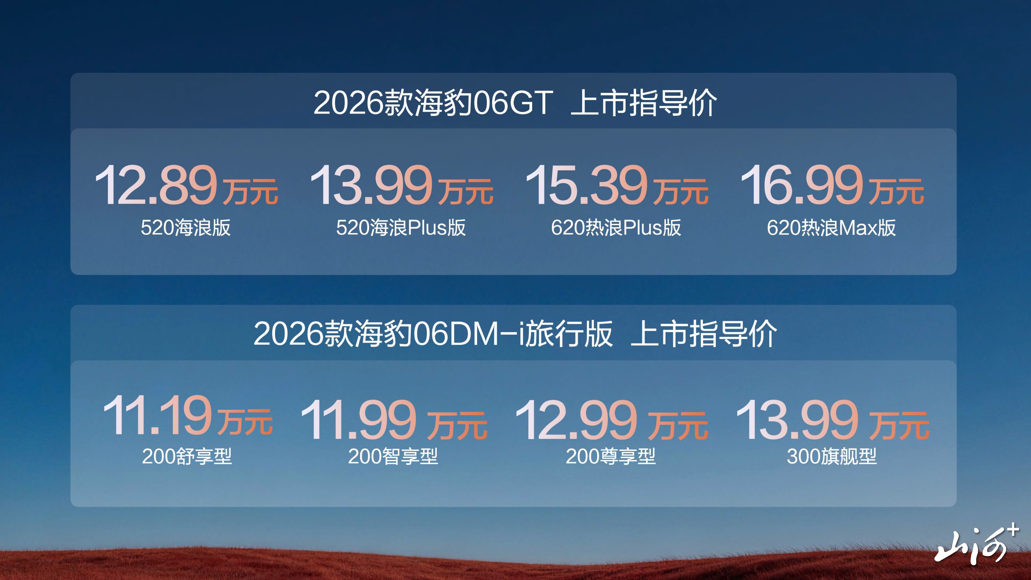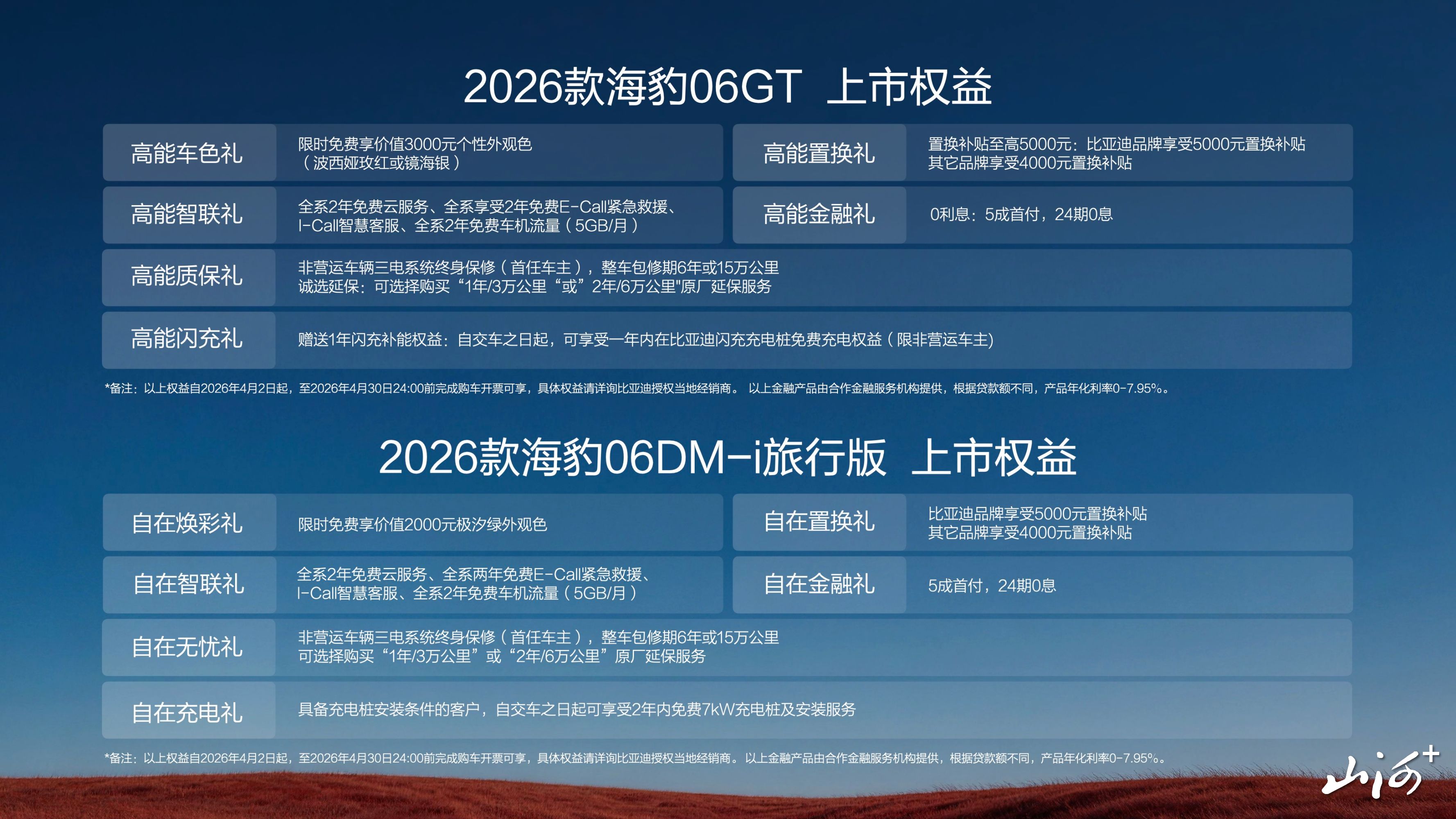 山西晚报·山河+讯 4月2日,比亚迪海洋网迎来两款重磅新车——2026款海豹06GT与2026款海豹06DM-i旅行版正式同步上市,此举标志着比亚迪在新能源乘用车市场的产品布局进一步深化。两款新车精准锚定不同用户需求,官方指导价区间分别为12.89万-16.99万元(海豹06GT)与11.19万-13.99万元(海豹06DM-i旅行版),同时推出购车、选装、养护等多项用户权益,目前已陆续进驻全国比亚迪海洋网门店。