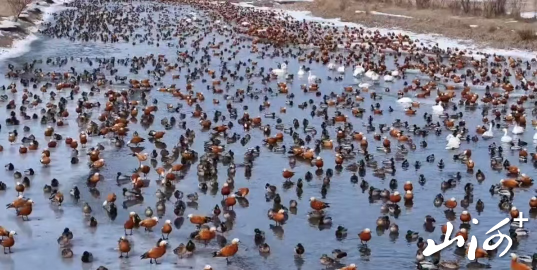 水质逆袭:如今,湿地的水质从治理前的劣V类提升至现在的优三类,河道也同步拓宽,昔日“水茫茫”的浑浊水域,变成了能滋养生灵的清澈碧波。黄华骄傲的说:“现在水干净了,不仅鸟来了,周边的空气也变好了。过去风里带着盐碱,现在的风里带着的是草木香。更重要的是,湿地实现了把风沙留在山阴,把清风送到北京的生态价值,成为北方生态屏障的重要一环。”在湿地工作的清洁工李大爷也深有感触:“之前这里根本就没啥人来,觉得光秃秃的没啥看头。但自从治理好后,每年都有游客来这里春游和秋游,大家都觉得咱这儿的水好、空气好。”更令人欣喜的是,该区域的野生大豆已被国家基因库收录。朔州市委宣传部四级调研员王华栋在得知这一消息后,特别强调了要做好植物安全相关工作,守护好这一珍贵的生态资源。生物多样性攀升:桑干河国家湿地公园现有国家一级保护动物2种、二级保护动物24种,其他动物种类逐年增加。每年3月(停留20-30天)、10月下旬至11月中旬(停留20余天),天鹅、灰鹤等候鸟如期而至,为了守护这些“远方来客”,公园每年都会用无人机高空投放玉米粒,今年已投放近1500斤。“人工投喂会惊扰鸟但用无人机从天上抛食,这样既能保证食物充足又能保证这些候鸟的安全。看着湖面满是候鸟,就像看一个‘天然养殖场’,心里特别暖。”黄华说。