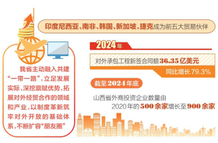 对外投资和工程承包业务同样是我省共建“一带一路”的一大亮点。2024年不断完善海外综合服务体系,非金融类直接投资达6517万美元,同比大增408.7%。这表明山西省企业加快了“走出去”的步伐,积极在海外布局,拓展国际投资领域,寻求更广阔的发展空间和资源;同时,对外承包工程新签合同额36.35亿美元,同比增长79.3%。截至2024年底,山西省外商投资企业数量由2020年的500余家增长至900余家。