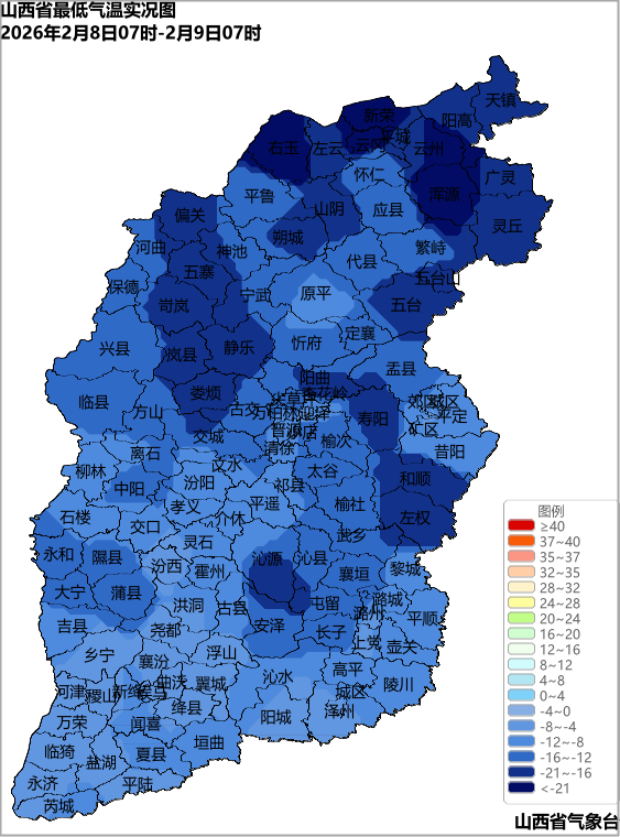 山西省2026年2月8日07时至2月9日07时最低气温实况,全省各地最低气温介于-24.4℃(新荣区)~-5.1℃(河津)之间。其中,平城区、广灵、云冈区、浑源、云州区、右玉、新荣区共7个县(市、区)在-20℃以下。