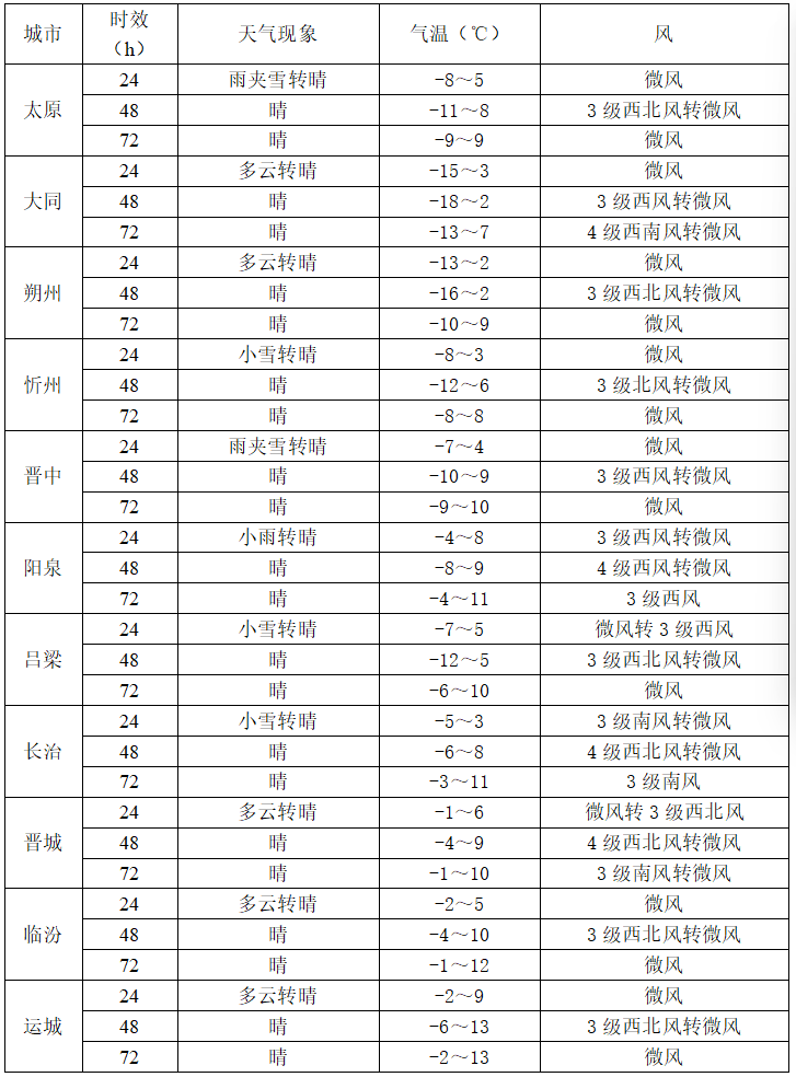 全省阴天转多云,太原、晋中、长治等地的部分和大同、忻州、阳泉、吕梁、临汾、晋城等地的局部地区有雨夹雪或小雪。